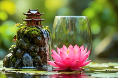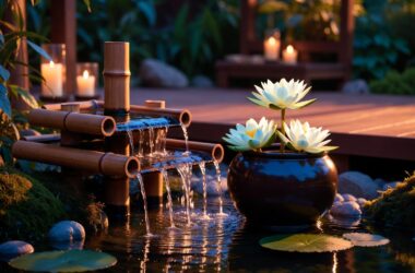 Read MoreA peaceful zen garden setup featuring a bamboo water fountain flowing into a calm pond, glowing lotus flower...