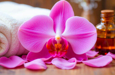 Read MoreA tranquil spa scene featuring two soft, rolled white towels draped with vibrant pink orchid blossoms, set o...
