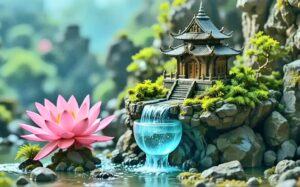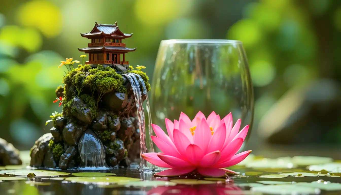 Prompt: “A miniature landscape scene featuring an East Asian style temple on a rocky ledge covered in moss. Water flows from beneath the temple into a transparent glass cup. A large pink water lily sits on the surface of the water to the left. The background is blurred green mountains and rocks. High definition, vibrant colors.”