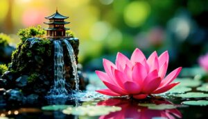 Prompt: “A miniature landscape scene featuring an East Asian style temple on a rocky ledge covered in moss. Water flows from beneath the temple into a transparent glass cup. A large pink water lily sits on the surface of the water to the left. The background is blurred green mountains and rocks. High definition, vibrant colors.”